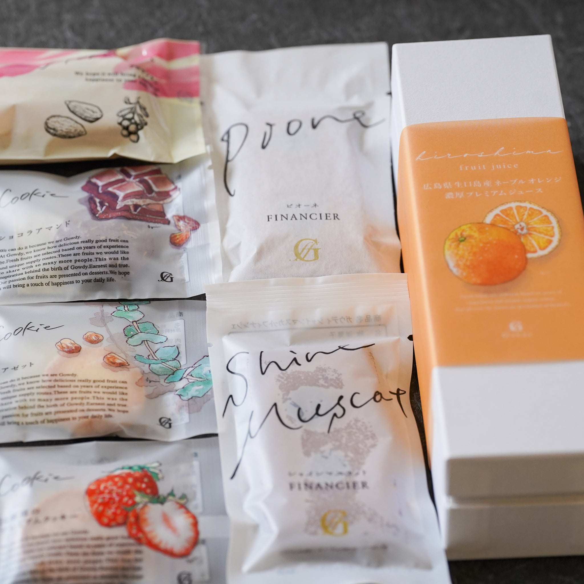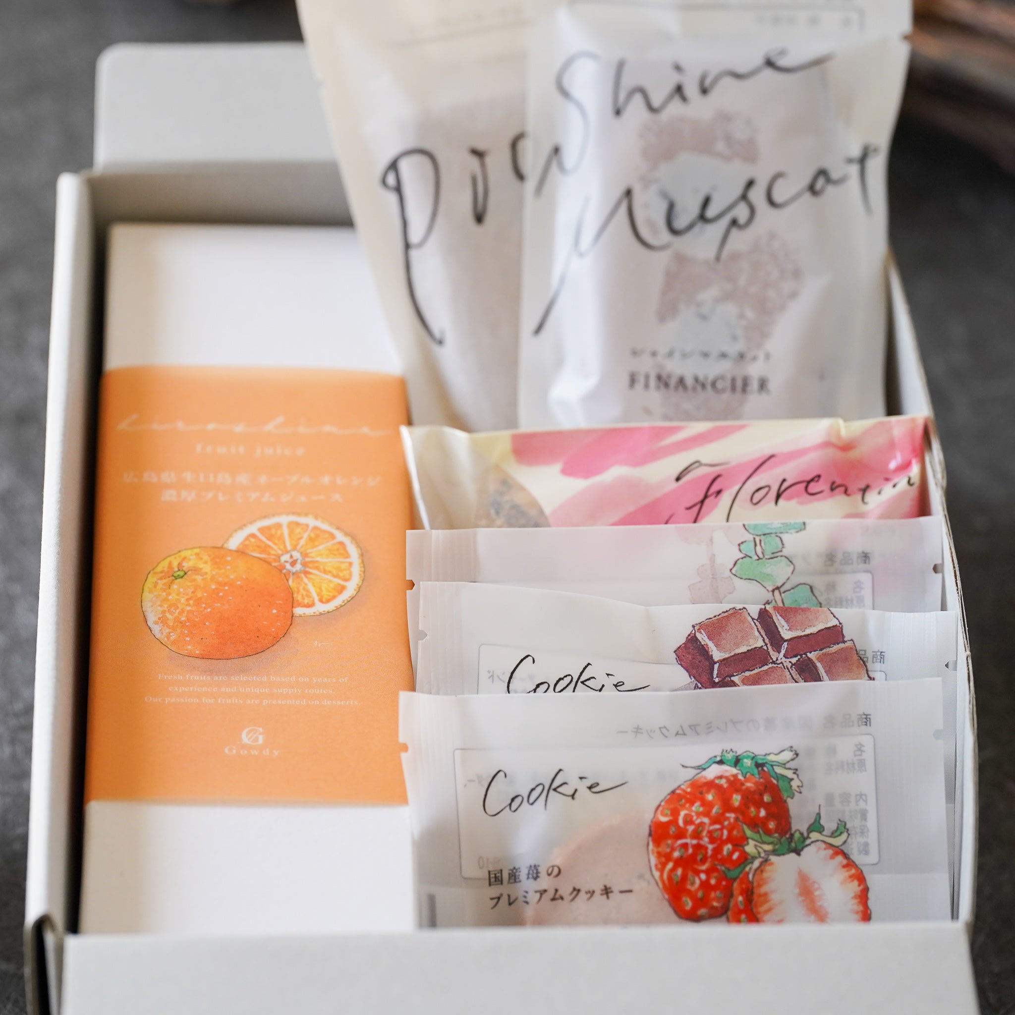 [内容量]・ネーブルオレンジジュース×1・シャインマスカットフィナンシェ×1・ピオーネフィナンシェ×1・フロランタン×1・国産苺のプレミアムクッキー1枚入り(小)×1・ショコラアマンド1枚入り(小)×1・ノアゼットシュガー1枚入り(小)×1